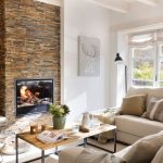 Als Möbel werden beige Stoffsofas und weiche Sessel verwendet, die mit dekorativen blauen, gelben oder blauen Regalen ergänzt werden können.