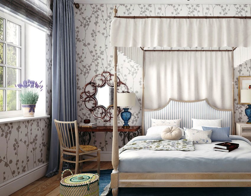 Ein Baldachin über einem großen Bett verleiht dem Raum Luftigkeit, ein heller durchscheinender weißer Stoff ist am besten dafür geeignet.