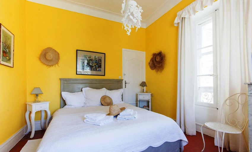 Es ist ratsam, das Bett mit einer blau-weißen Tagesdecke zu bedecken und das Dekor mit Zitronen-, Oliven- oder gelben Kissen zu ergänzen.
