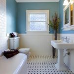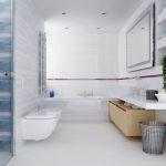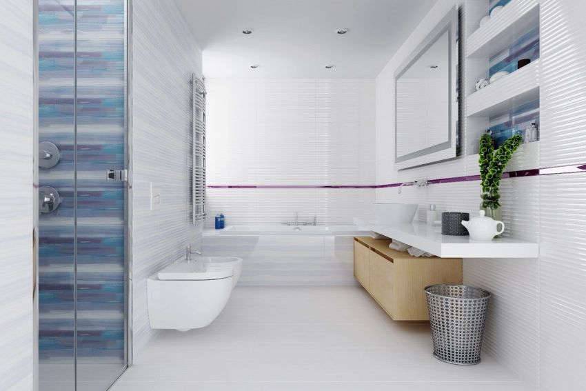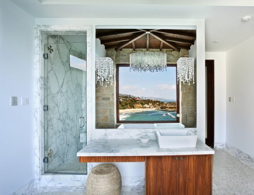 Hilfreicher Tipp! Künstliche Beleuchtung im Badezimmer wird normalerweise an der Decke montiert. Es ist jedoch erforderlich, die Lampen so zu platzieren, dass das Licht nur in die erforderlichen Bereiche fällt: über dem Waschbecken, dem Badezimmer und in der Nähe des Spiegels. Der Rest des Raumes sollte halb dunkel und kühl sein.
