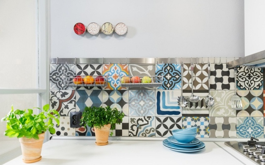 Fliesen mit Drucken in Form von Blumen und Mustern wirken im italienischen Kücheninterieur harmonisch
