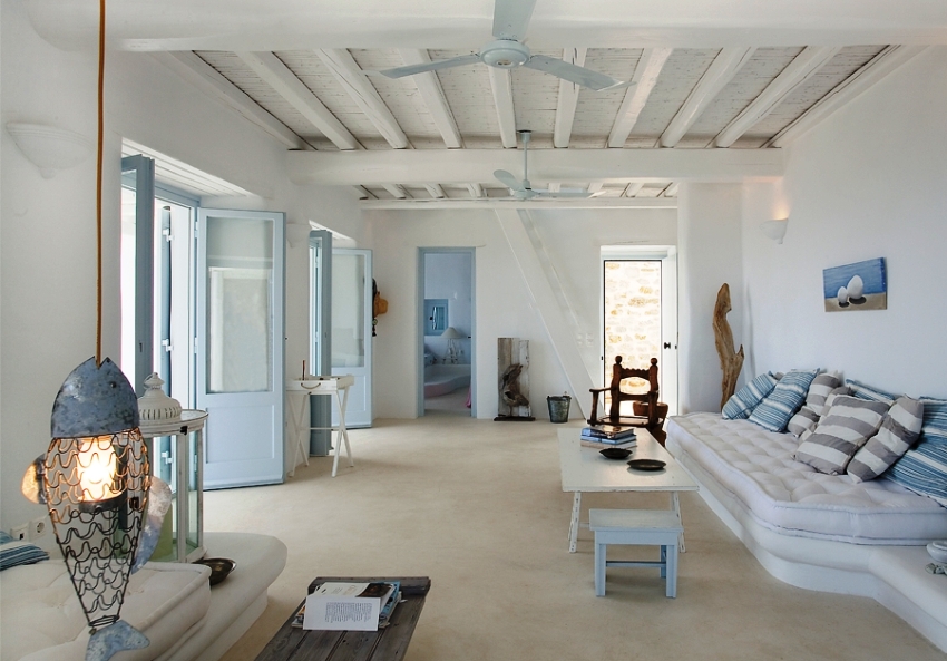Fotos des Wohnzimmers im italienischen Stil (griechischer oder spanischer Stil) sorgen für eine Atmosphäre der Frische, Luftigkeit, Leichtigkeit und Meeresbrise im Raum.