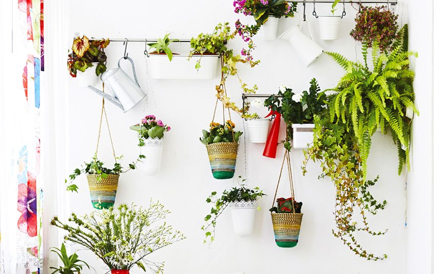 Interessante Töpfe auf Metallhaltern können eine großartige Lösung in einem Raum mit gestrichenen Wänden sein