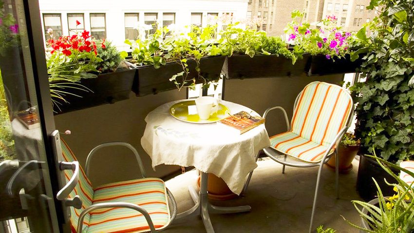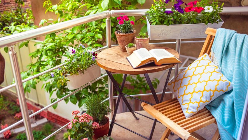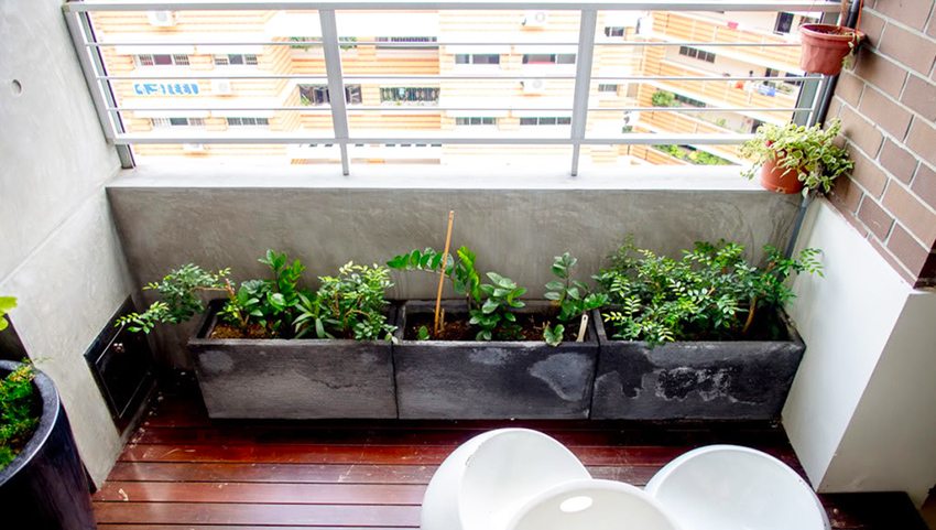Bei der Installation von Blumen in Wandnähe sollte die Dekoration der Loggia praktisch und waschbar sein