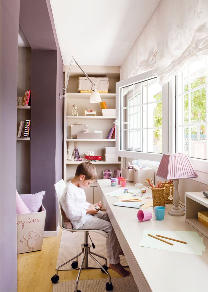 - Installieren Sie kompakte Schränke und Regale, um Bücher und Dinge aufzunehmen, die für die Arbeit notwendig sind. Wenn Sie einen kreativen Workshop für Handarbeiten organisieren möchten, stellen Sie ein Gestell mit vielen Fächern und Schubladen über die Arbeitsfläche.