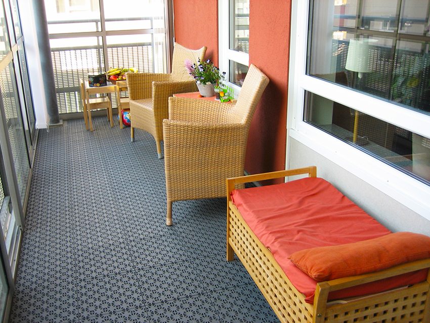 Fliesen werden häufig zur Dekoration des Bodens auf der Loggia verwendet, da diese gegen Feuchtigkeit und Temperaturänderungen beständig ist