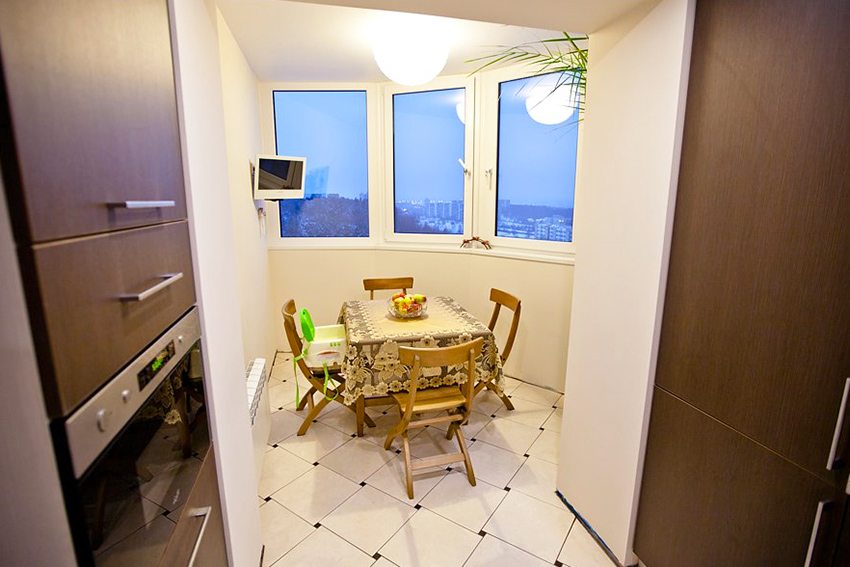 - Loggia mit Küche - diese Kombination ist besonders in kleinen Wohnungen von Vorteil. In Kombination mit dem Loggia-Bereich können Sie einen Stauraum für Küchenutensilien oder eine kleine Bar mit Theke einrichten oder den Platz frei lassen.