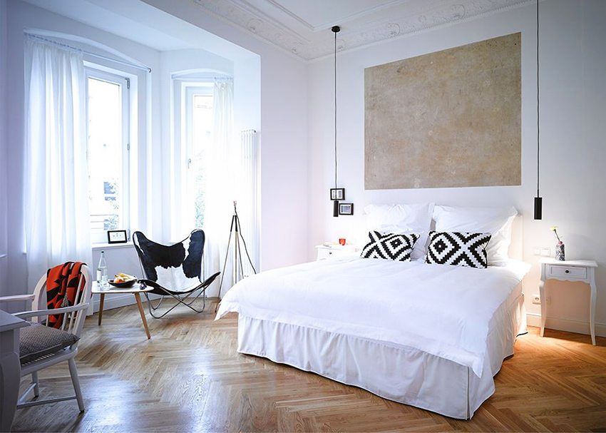 Nachdem Sie ein Bett organisiert haben, sollten Sie sich auf jeden Fall um die Dekoration kümmern. Als Dekoration für die Wände können Tapeten in angenehmen und unauffälligen Farbtönen verwendet werden, die für die Innenausstattung von Schlafzimmern geeignet sind. Es ist besser, wenn ihr Ton der Farbe der Vorhänge und des Sofas entspricht. Ein weicher, langfloriger Teppich sieht auf dem Boden gut aus.