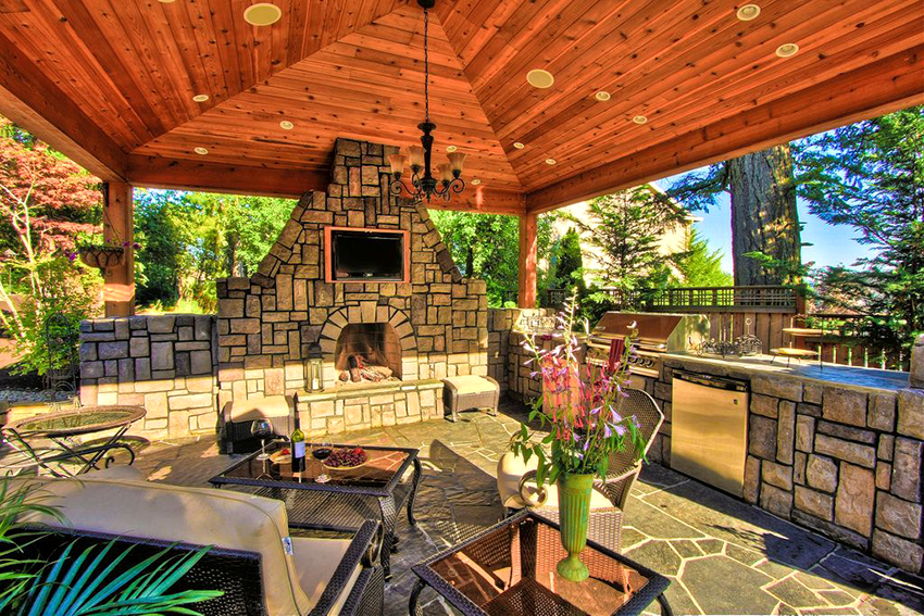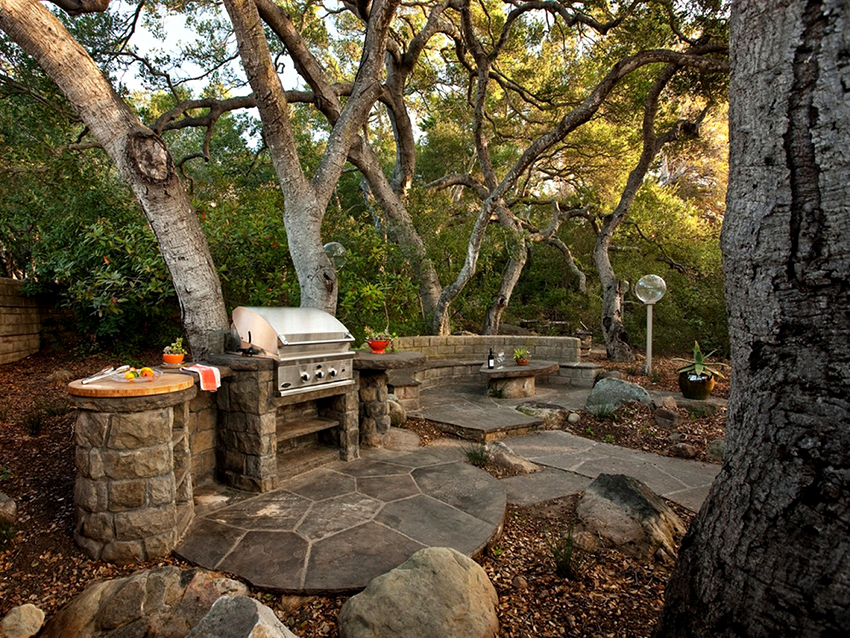 In der Regel bedeutet das Vorhandensein eines Grills, dass sich in der Nähe dieses Geräts ständig Menschen aufhalten. Wenn Sie sich für die Installation eines gemauerten Grills im Pavillon entscheiden, empfehlen Landschaftsspezialisten, kein Gras oder Blumen in die Umgebung zu pflanzen. Es ist besser, den Bereich mit dekorativem Kies, Steinen oder Fliesen zu bedecken. In diesem Fall sieht der Bereich in der Nähe des Grills ordentlicher aus.