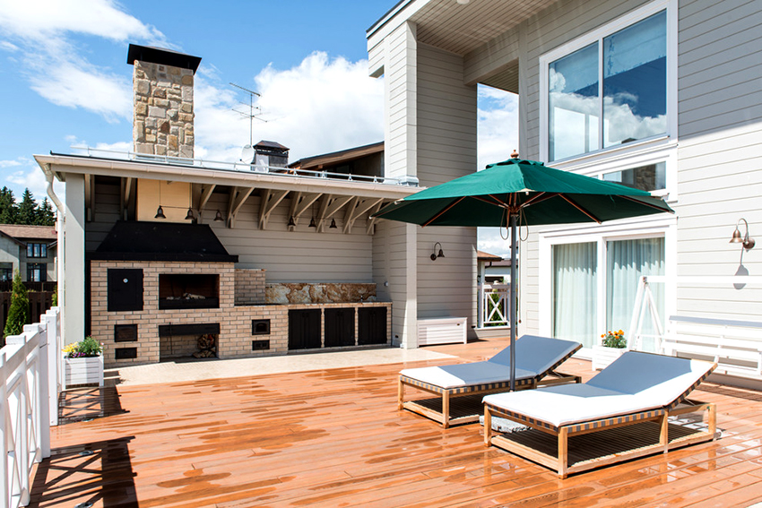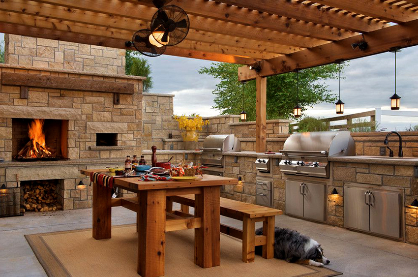 Dieses Gerät kann durch Bildung einer Hilfsarbeitsfläche mit zusätzlichen Funktionen ausgestattet werden. Hier können Sie Küchenutensilien, Geschirr, geschnittenes Essen usw. bequem platzieren. Um es zu errichten, müssen Sie eine Grube graben und das Fundament parallel zur Seitenwand gießen. Wenn die Oberfläche trocken ist, können Sie mit dem Verlegen von Ziegeln beginnen. Sie müssen sechs Zeilen bilden. Sie können Dielen, dickes Sperrholz, Fliesenböden, Marmorplatten usw. verwenden, um eine Arbeitsplatte zu erstellen.