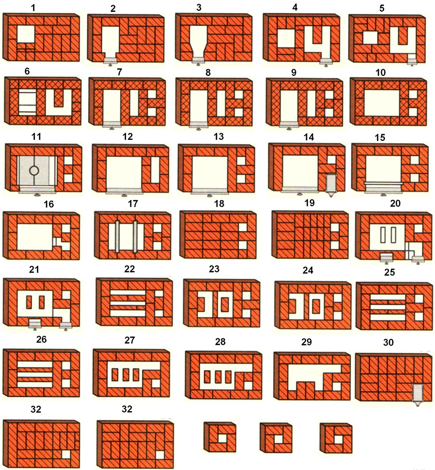 Das Layout des Mauerwerks ist ziemlich klar, es sieht aus wie ein umgekehrter Buchstabe "W". Diese Form wird bis zur 6. Reihe beobachtet. Dann wird die Verlegung auf der Hälfte der Struktur fortgesetzt und hat dementsprechend eine U-Form.