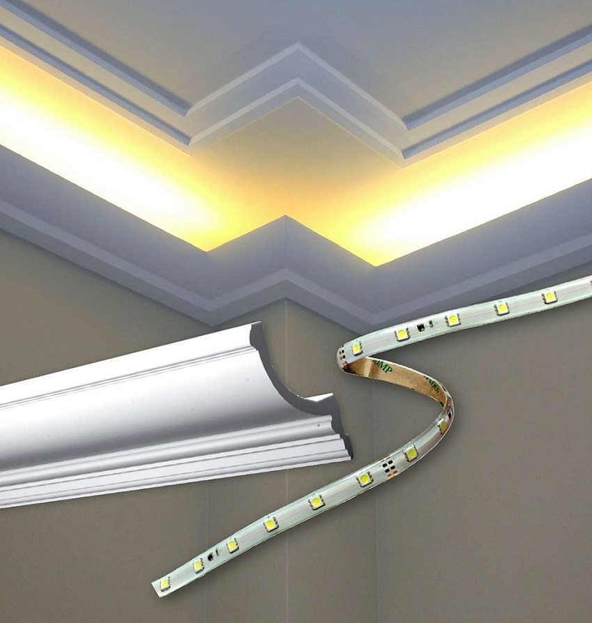 Useful advice! A concealed lighting can be placed in the molding 10 cm from the ceiling. This will add impact to your interior. Power Supply it is better not to place it under the ceiling, as it heats up quite a lot and has a decent weight.