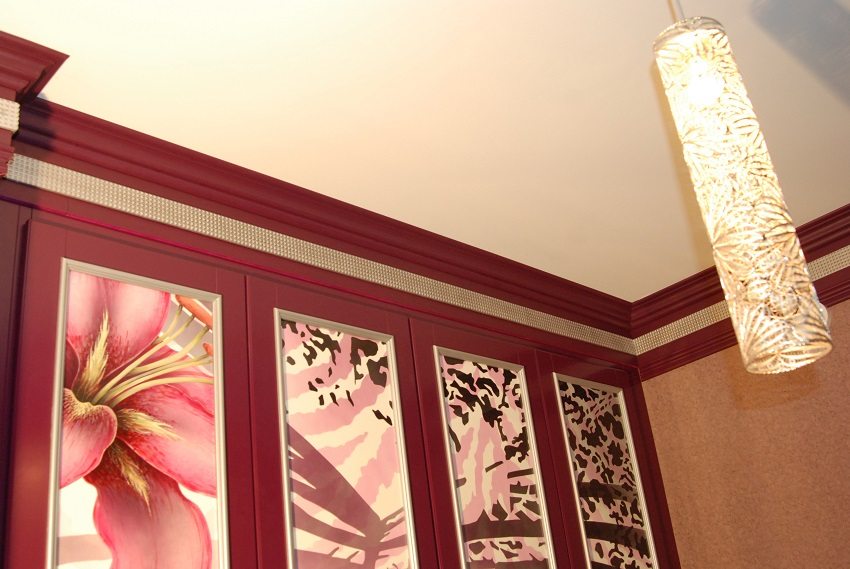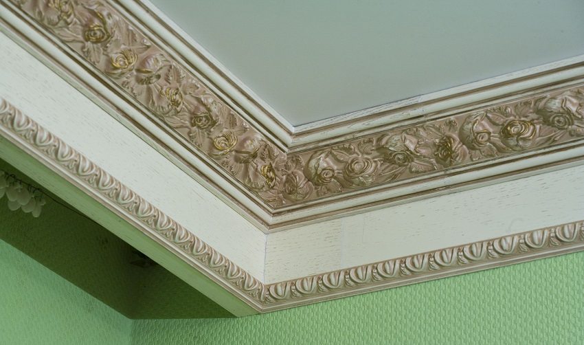 The ceiling plinth for a stretch ceiling made of polyurethane is more flexible, it can take on various forms (see photo). Polyurethane is glue-resistant, washable, for bathroom and the kitchen will fit perfectly. But polyurethane sometimes sags under its own weight. Therefore, it is necessary to mount the polyurethane skirting board very carefully, and if it is very wide, it is more advisable to fix it with self-tapping screws, and fill the attachment points.