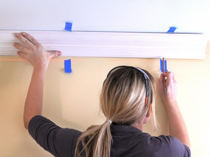 Before installing the ceiling plinth, a marking is carried out, along which its lower edge will be glued