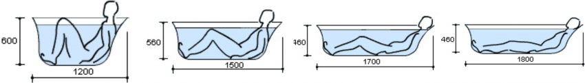 Bath dimensions depending on the comfortable position of the person in the bowl