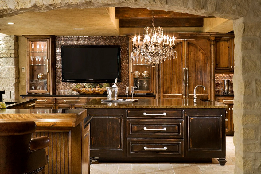 La instalación del televisor en un nicho prediseñado se considera una buena opción de ubicación porque la pantalla está protegida contra vuelcos accidentales y tiene un espacio de seguridad limitado. No solo puede construir los electrodomésticos en un nicho, sino que también puede usar parte del juego de cocina para este propósito. El dispositivo se coloca frente al grupo de comedor o sala de estar con muebles tapizados, y generalmente se utilizan para esto los gabinetes superiores del juego de cocina.