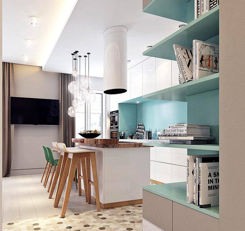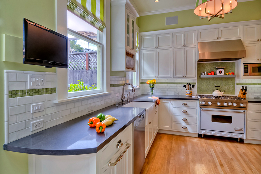 En una cocina con un área promedio de 10 a 15 m², ya hay mucho más espacio libre, por lo que es bastante aceptable instalar una pantalla con una diagonal mayor. Adecuado tanto para televisores de 17 "como para pantallas más anchas, de hasta 25". Es importante tener en cuenta el siguiente requisito: cuanto mayor sea la diagonal, más lejos de los ojos debe ubicarse el panel. La distancia óptima a la pantalla es de 2 m.