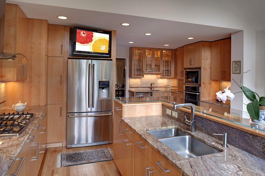 Los fabricantes han desarrollado tipos de equipos de alta tecnología con una pantalla incorporada para un diseño interior ultramoderno. Esto incluye, por ejemplo, una campana extractora con un televisor, que, además de la función principal de purificación del aire, se distingue por la presencia de una pantalla incorporada. Sin embargo, en este caso, debe estar preparado para un gasto significativo. Este grupo también incluye refrigeradores modernos con monitores LCD integrados. Por lo general, estos son modelos grandes de Side-by-Side con un televisor integrado de 8 o 10 pulgadas, que es suficiente para uso en segundo plano.