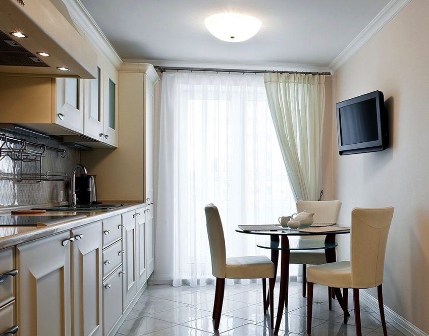 Al instalar un televisor en una cocina, lo primero a considerar es la cantidad de luz natural. Cuando la cocina está orientada hacia el lado sur u oeste, intensamente iluminada por la luz del día, los electrodomésticos deben colocarse en la parte más sombreada de la habitación, más cerca de la entrada. De lo contrario, el resplandor estará constantemente presente en la pantalla y el dispositivo también se calentará bajo la influencia de la luz solar, lo que provocará un sobrecalentamiento constante, lo que puede hacer que el equipo falle.