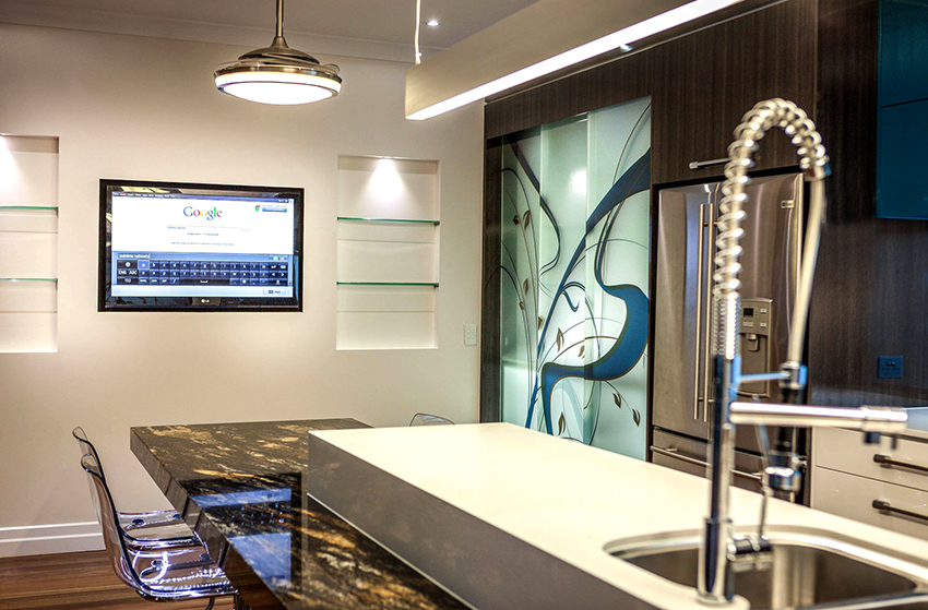 Una opción de ubicación interesante es incrustar un televisor detrás de un delantal de cocina de vidrio.