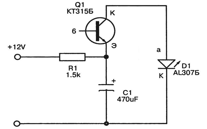 El circuito consta de un transistor de baja potencia Q1 (el silicio de alta frecuencia KTZ 315 o sus análogos son adecuados), una resistencia R1 820-1000 Ohm, un condensador C1 de 16 voltios con una capacidad de 470 μF y una fuente de LED. Cuando se enciende el circuito, el condensador se carga a 9-10 V, después de lo cual el transistor se abre por un momento y le da la energía acumulada al LED, que comienza a parpadear. Este esquema se puede implementar solo cuando se alimenta desde una fuente de 12V.