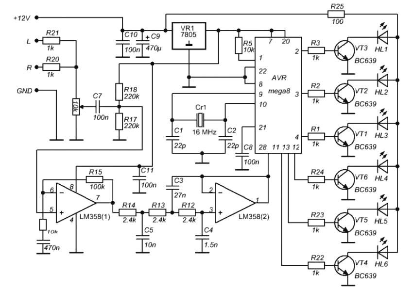 La base VT1 recibe una señal con amplitud y frecuencia variables. En el caso de que las fluctuaciones de la señal superen un umbral predeterminado, el transistor se abre y el LED se enciende. La desventaja de este esquema es la dependencia del parpadeo del grado de la señal de sonido. Por lo tanto, el efecto de la música en color aparecerá solo en un cierto grado de volumen de sonido. Si el sonido aumenta. el LED estará encendido todo el tiempo y, al disminuir, parpadeará levemente.