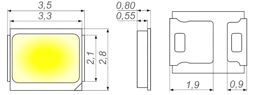 Las principales características de los LED 2835 SMD incluyen un área de radiación aumentada. En comparación con el SMD 3528, que tiene una superficie de trabajo redonda, el área de radiación del SMD 2835 tiene una forma rectangular, lo que contribuye a una mayor salida de luz con una menor altura del elemento (aproximadamente 0,8 mm). El flujo luminoso de dicho dispositivo es de 50 lm.
