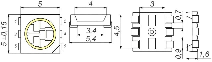 El diseño de la carcasa del SMD 5050 contiene tres LED similares. Las fuentes de LED de colores azul, rojo y verde tienen características técnicas similares a los cristales SMD 3528. La corriente de funcionamiento de cada uno de los tres LED es de 0.02A, por lo que la corriente total de todo el dispositivo es de 0.06A. Para evitar que los LED se dañen, se recomienda no superar este valor.