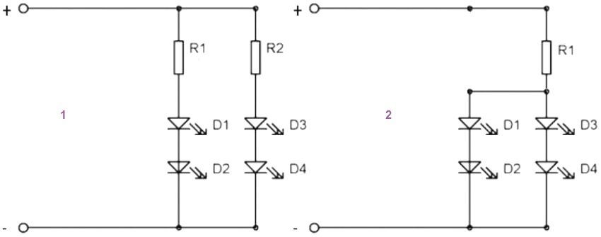 Diagramas de conexión en paralelo de LED. En la opción 1, se usa una resistencia separada para cada circuito de diodos, en la opción 2, una común para todos los circuitos