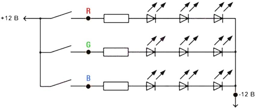Para lograr un efecto completo, use una combinación de colores de música en LED con una división del rango de sonido en tres partes. El circuito con un transductor de sonido de tres canales está alimentado por una fuente de 9V. Se puede encontrar una gran cantidad de esquemas de música en color en Internet en varios foros de radioaficionados. Estos pueden ser esquemas de música en color usando una tira de un solo color, tira de LED RGB, así como esquemas para encender y apagar los LED sin problemas. También en la red puede encontrar diagramas de luces de marcha en LED.