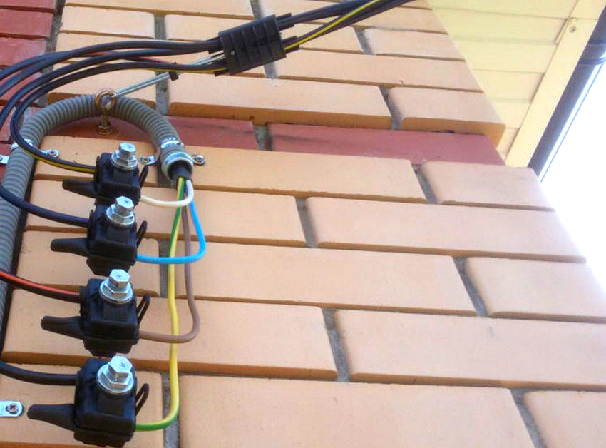 Si el tablero de medición se coloca en la pared de la casa, el grifo, que se conecta a la línea principal mediante una abrazadera, se inserta en el tablero de medición y se conecta a la máquina. Si el SIP desempeña el papel de conductor de derivación, se montan las denominadas abrazaderas de anclaje en la línea de soporte y en la pared, que aseguran los cables.