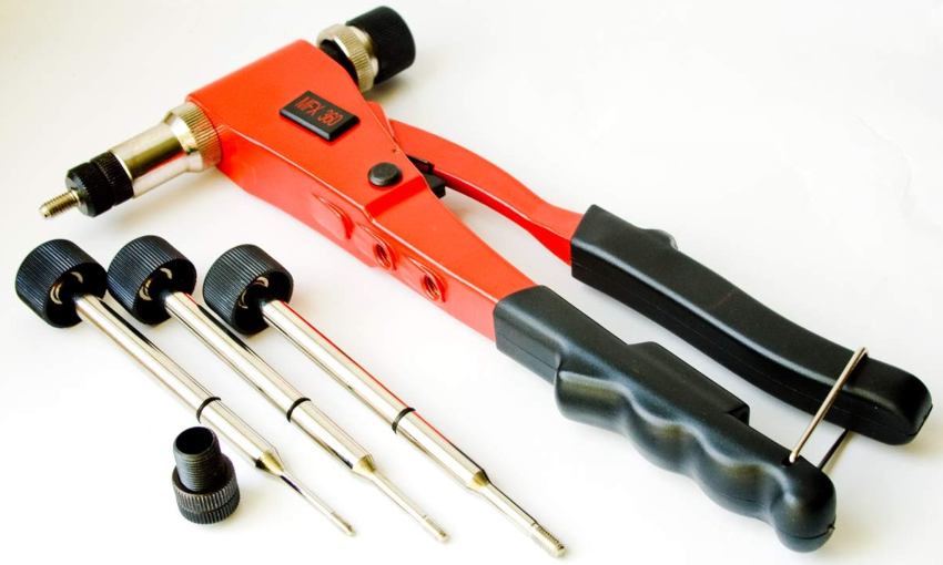 La esencia del funcionamiento de la remachadora es bastante simple. Retrae y corta varillas de acero roscadas a través de un remache de cabeza tubular fabricado en aluminio. Las varillas se engrosan y, a medida que se tira del remache dentro del tubo, se expande.