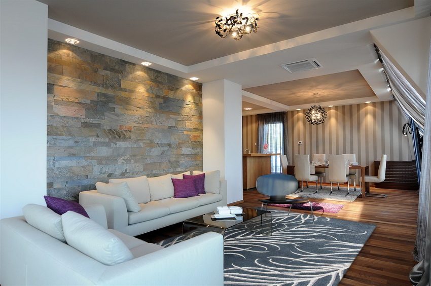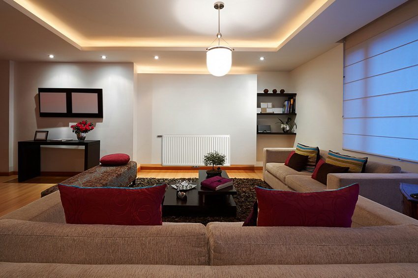 La recepción de la disposición de la iluminación central con lámparas LED de techo empotradas en puntos (los ejemplos de fotos lo ilustran) le permite lograr una iluminación de alta calidad de toda la habitación y colocar acentos de luz en elementos decorativos individuales. La combinación de varios tipos de iluminación, operando en diferentes modos, ahorra significativamente los costos de energía.