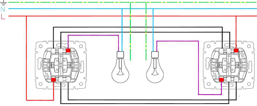 Todas las acciones para la instalación de dispositivos de conmutación se llevan a cabo sobre la base del diagrama de conexión de 2 lugares de interruptores de paso, que se pueden encontrar en Internet. Se diferencia de la instalación de interruptores convencionales, ya que hay tres cables en lugar de los dos habituales. En este caso, se usan dos cables como puente entre dos interruptores ubicados en diferentes lugares de la habitación, y el tercero se usa para alimentar la fase.