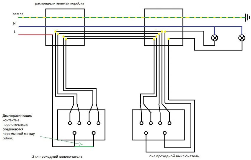 El circuito de un interruptor de paso desde dos lugares se lleva a cabo utilizando dos dispositivos de paso a través de una sola tecla que funcionan solo en pares. Cada uno de ellos tiene un contacto en el punto de entrada y un par en el punto de salida.