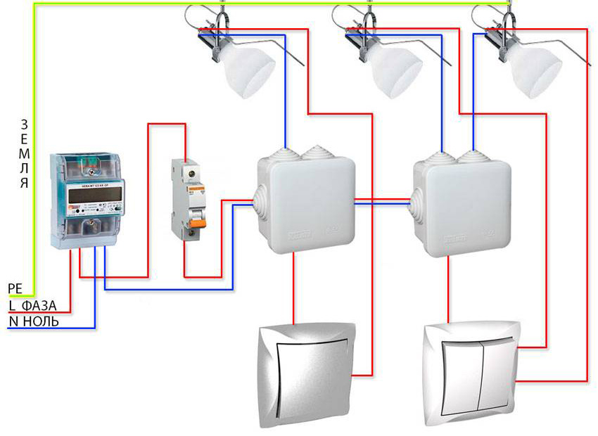 Los interruptores están conectados en la ruptura del cable de fase, y el cero, que pasa a través de la caja de conexiones, se dirige al dispositivo de iluminación. Saltar la fase a través del interruptor garantizará la seguridad durante la reparación y el mantenimiento de la luminaria.