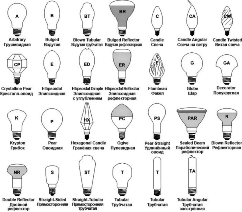 La primera opción es el elemento más común. Las lámparas con tal base pueden tener una potencia en el rango de 5-18 W. Los tipos más populares de domos para tales productos son hemisferio y bola. Las lámparas con base e27 se utilizan para lámparas cerradas y candelabros en salas de estar.