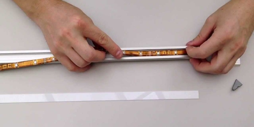 Por separado, vale la pena considerar el caso cuando se trata de instalar una tira de LED de alta potencia. En este caso, para mayor estética, la cinta se coloca en perfil. En primer lugar, se realiza el tendido y solo entonces se conectan los cables de alimentación. Después de eso, la cinta debe fijarse con la misma cinta de doble cara y el perfil en sí debe fijarse en el gabinete.
