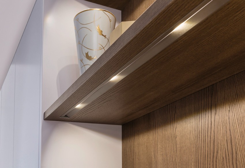 - Iluminación interna de vitrinas. Esta solución se ve especialmente hermosa si hay vidrio esmerilado en sus puertas;