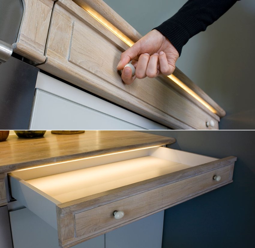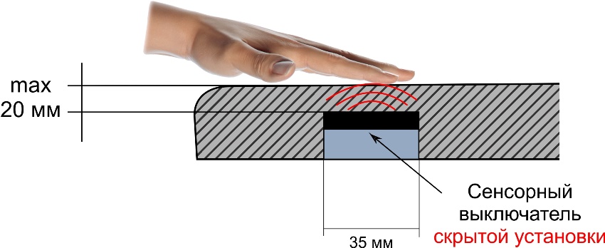 Los interruptores táctiles suelen estar ubicados directamente al lado de la propia cinta, ya que parecen un módulo y no estropean la apariencia de la cocina. Pero al mismo tiempo es muy importante recordar que el sensor reacciona a cualquier contacto, por lo tanto, la ubicación debe excluir toques accidentales a los que el sensor pueda reaccionar.