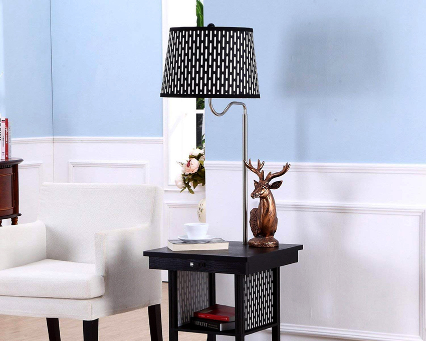 Una lámpara de pie con mesa crea un ambiente especial en la habitación, la hace acogedora y familiar. Tales lámparas no solo decoran el interior, sino que también lo llenan de funcionalidad. Siempre habrá un lugar en el dormitorio para poner las gafas y el teléfono, en el salón podrás leer un libro o hacer manualidades. Es conveniente guardar el control remoto del televisor sobre la mesa, que a menudo se pierde. A pesar de su utilidad, las lámparas de pie con mesa no ocuparán mucho espacio.