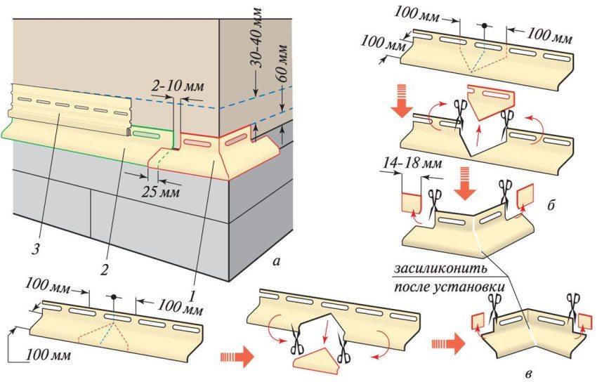 Instrucciones para instalar el reflujo y la placa de inicio frente al revestimiento de la casa con revestimiento de vinilo: a - vista general; b - esquina exterior; â - esquina interior; 1 - esquina exterior, 2 - marea baja; 3 - barra de inicio