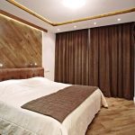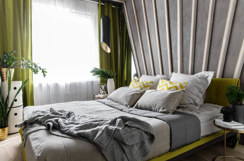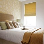 Para que el interior sea completo y el dormitorio sea acogedor, se presta especial atención al diseño de la abertura de la ventana. Las cortinas crean una atmósfera de aislamiento y privacidad en el dormitorio. Si no desea abarrotar la habitación con cortinas voluminosas que ocupan mucho espacio, puede limitarse a la instalación de cortinas romanas hechas de material denso.