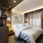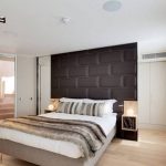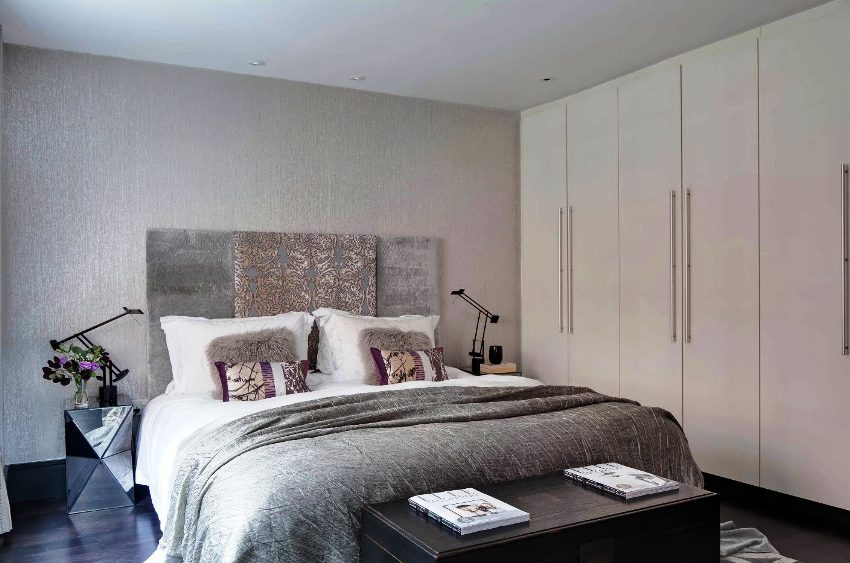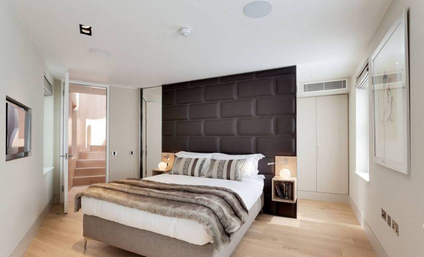 En la foto de los diseños de dormitorios modernos, puede ver otra forma conveniente de organizar el espacio, cuando los espacios de almacenamiento están ubicados detrás de la cabecera de la cama y a los lados de la misma. En este caso, se libera mucho espacio libre, pero la imposibilidad de instalar mesitas de noche se considera una desventaja significativa. Otro inconveniente es la ubicación de todos los muebles a lo largo de una pared, lo que hace que el interior se sienta ocupado.