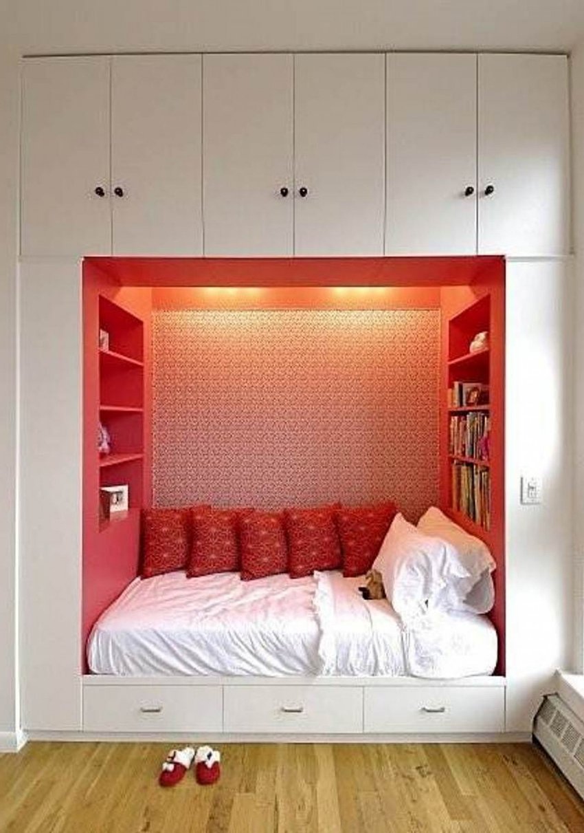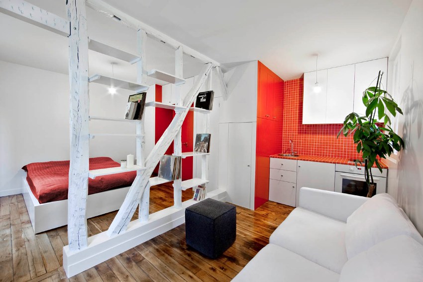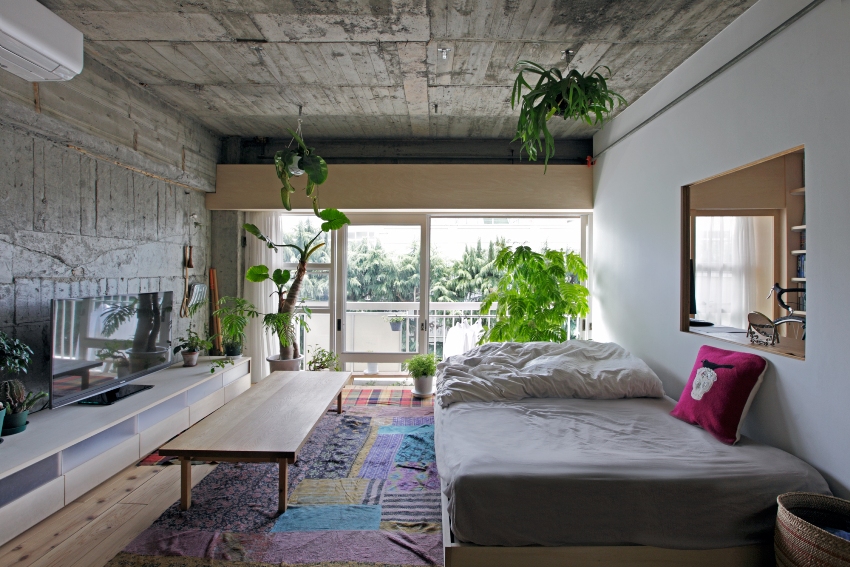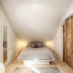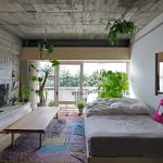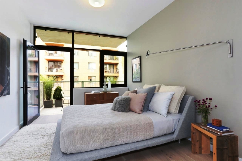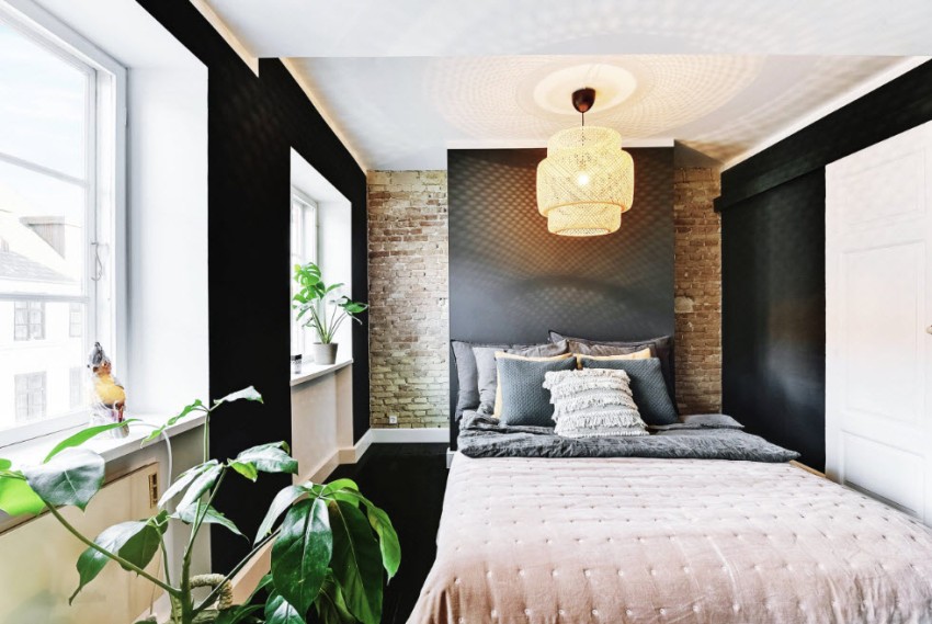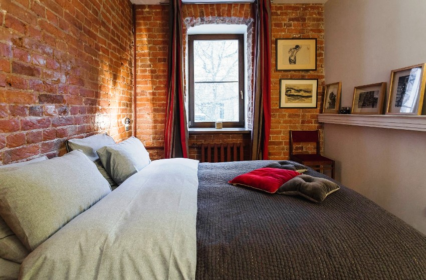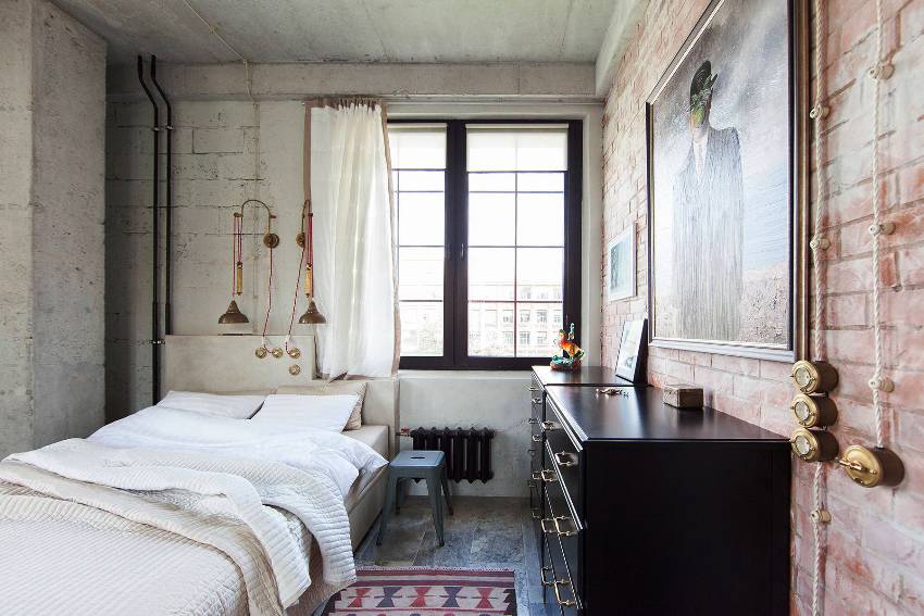 Las superficies de mampostería rugosa y sin tratar encajarán perfectamente en un dormitorio estilo loft de 12 pies cuadrados. metro