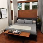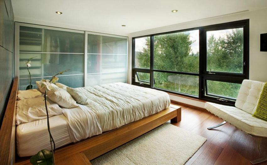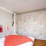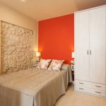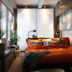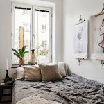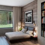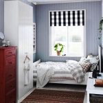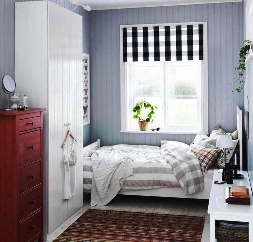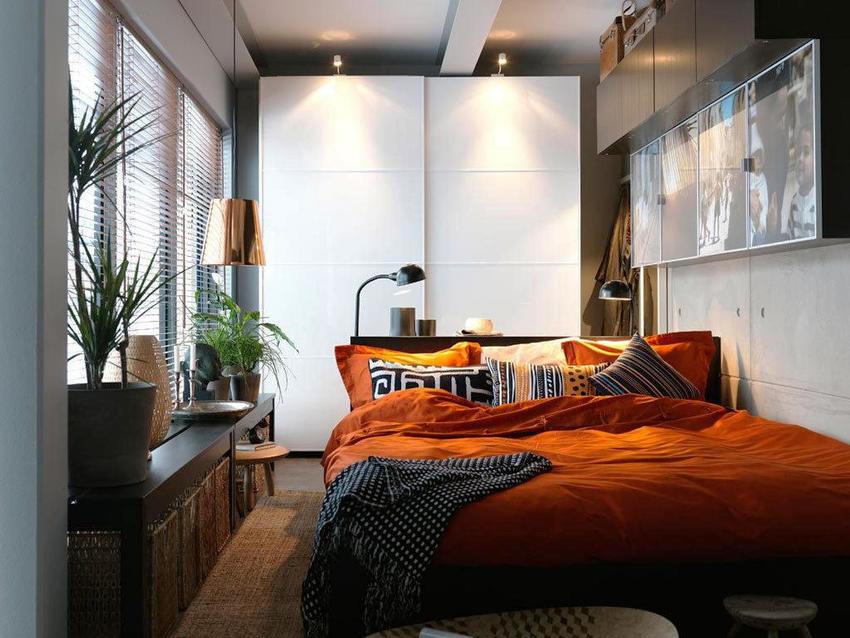 Otra forma de organizar el espacio de un dormitorio pequeño es instalar una cama contra una pared libre cerca de la ventana. En este caso, la cama no se coloca en el centro de la pared, sino que se mueve lo más posible hacia la ventana para que haya suficiente espacio para acomodar una mesita de noche pequeña. Un armario estrecho pero largo con puertas correderas se instala contra la pared opuesta a la ventana, cuyos accesorios interiores se distinguen por una gran cantidad de estantes y cajones. Las desventajas de esta opción son las dimensiones bastante grandes del gabinete y una pequeña cantidad de espacio libre.