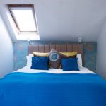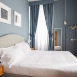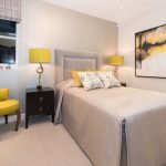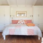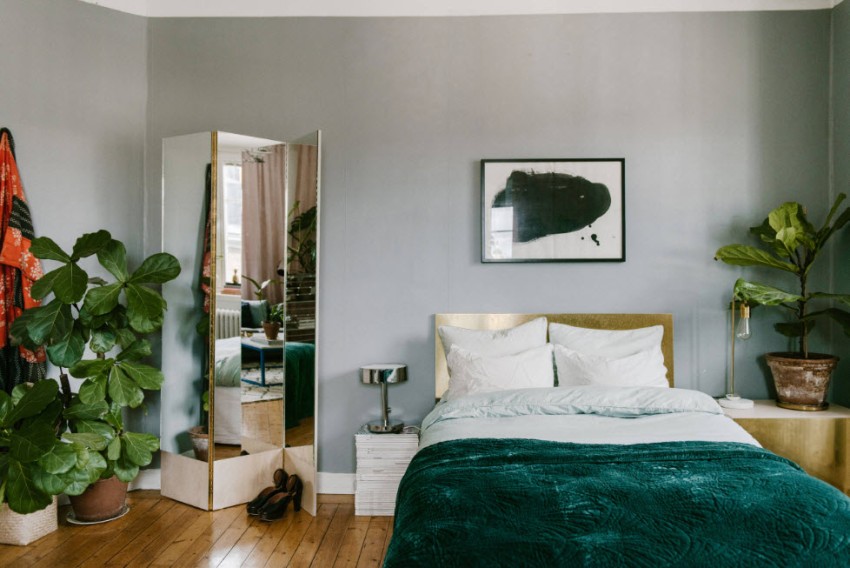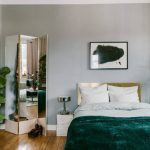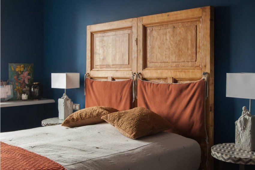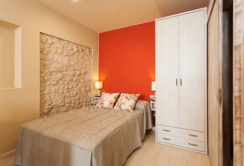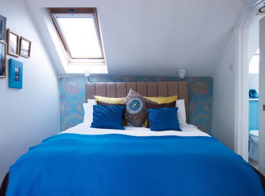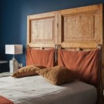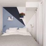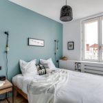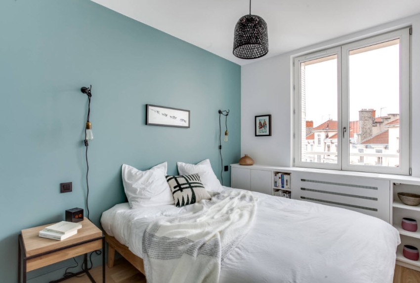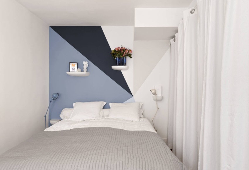 La pared decorativa en la cabecera de la cama con color es un buen truco de diseño para resaltar el mueble central en un dormitorio pequeño.