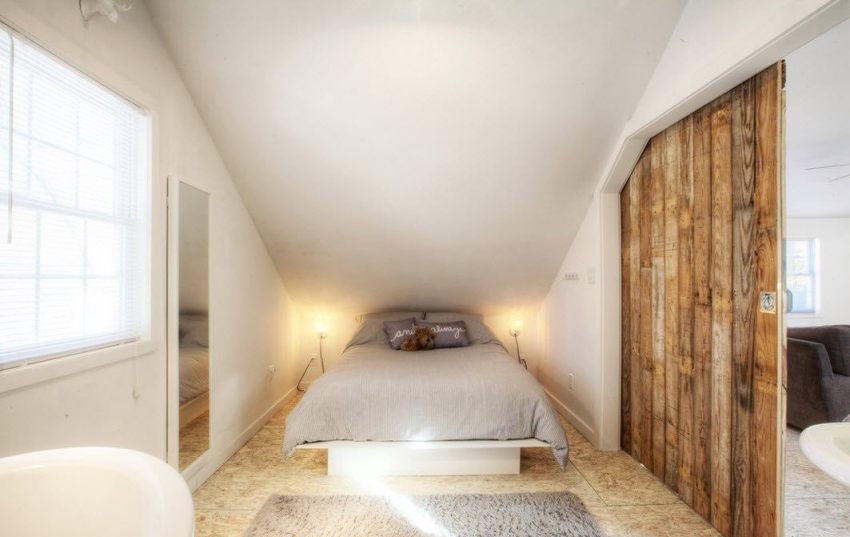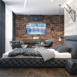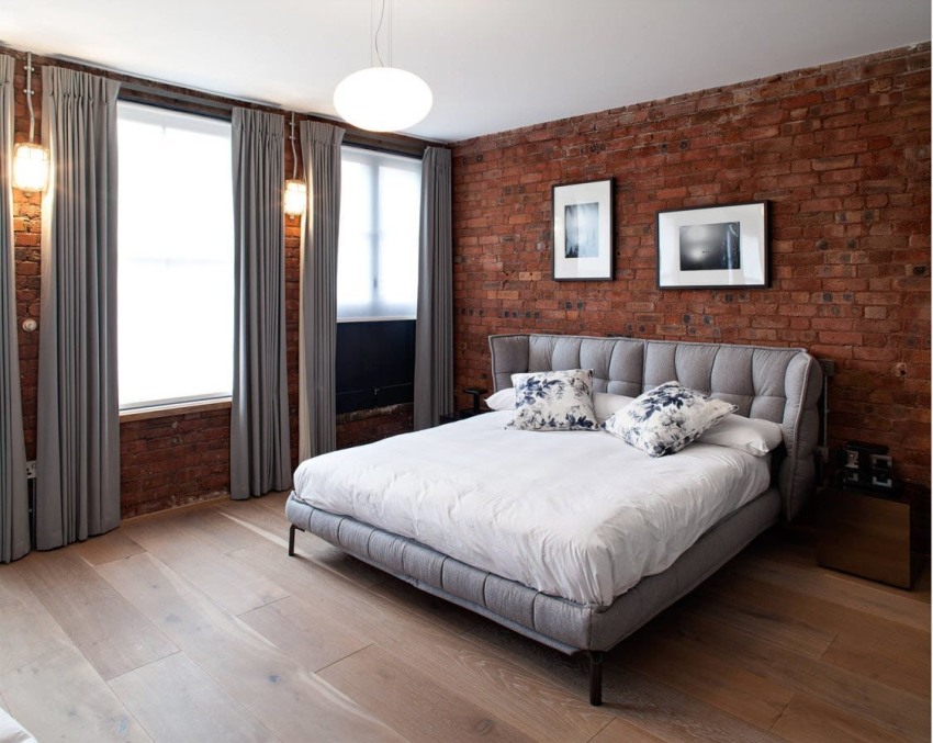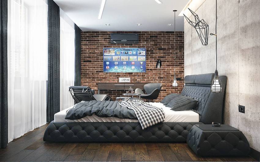 - Desván. El interior brutal y atrevido es perfecto para decorar un dormitorio. Se da preferencia a las superficies rugosas, sin tratar, con un efecto descuidado. El dormitorio acoge una combinación de muebles antiguos y tecnología moderna, contra una pared de ladrillos.