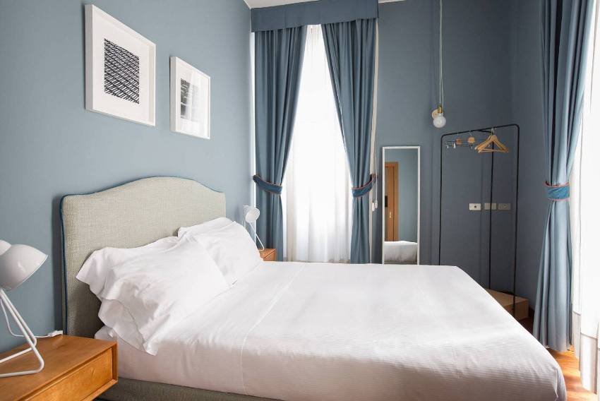 También se recomienda usar un acabado ligero en las paredes, que no solo ayuda a aumentar visualmente el área, sino que también tiene un efecto relajante en una persona. Los colores más populares para decorar paredes de dormitorios son: