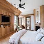 La cama también se puede instalar a lo largo de la pared central, perpendicular a la que se encuentran las paredes con una ventana y una puerta. En este caso, las mesitas de noche se colocan simétricamente a los lados de la cama, y el televisor se fija en la pared opuesta en una estructura modular, que incluye tTV umba y dos alacenas ubicadas a ambos lados del televisor. Se puede disponer de espacio de almacenamiento adicional encima del televisor.